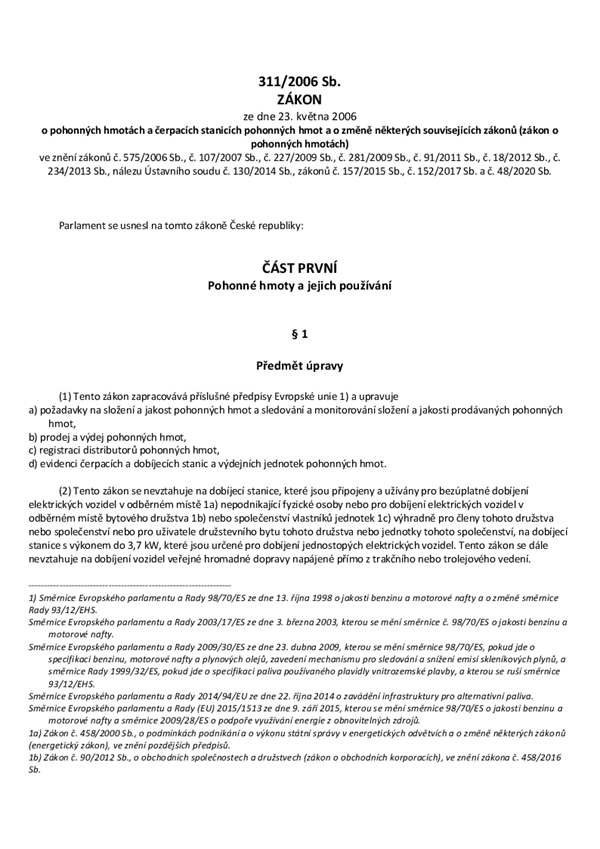 Zákon o pohonných hmotách a čerpacích stanicích pohonných hmot z roku 2006 je klíčovým zákonem pro oblast pohonných hmot, jejich distribuci i provozování čerpacích stanic. Zákon je v gesci Ministerstva průmyslu a obchodu a v současné době není projednáván žádný návrh na jeho novelizaci.